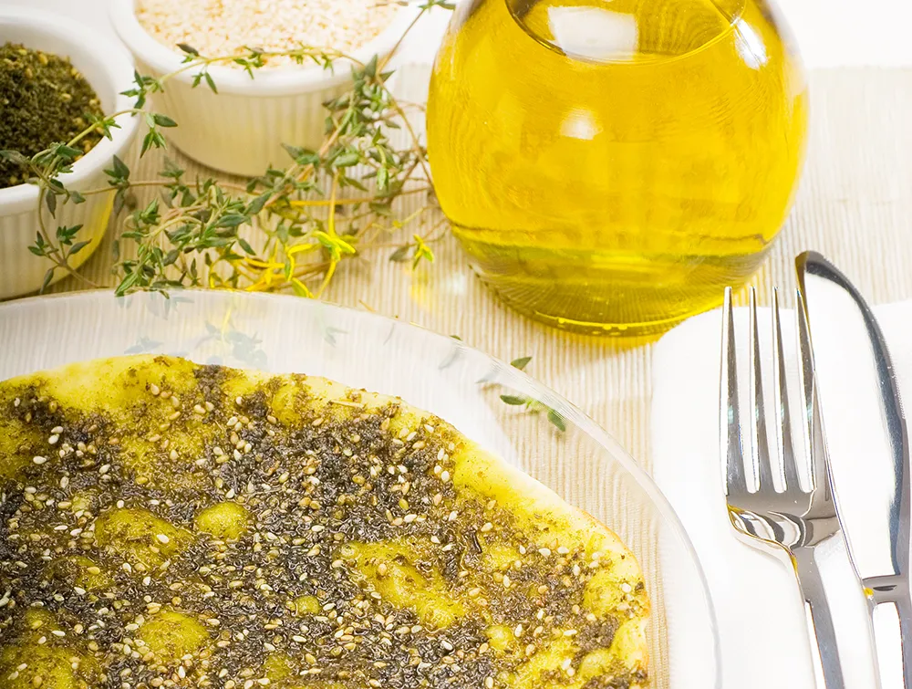 A la sortie du four, nous vous suggérons de disposez au centre de la Mann’oushe un peu de labné ou des légumes frais comme la tomate, concombre et de la menthe fraîche