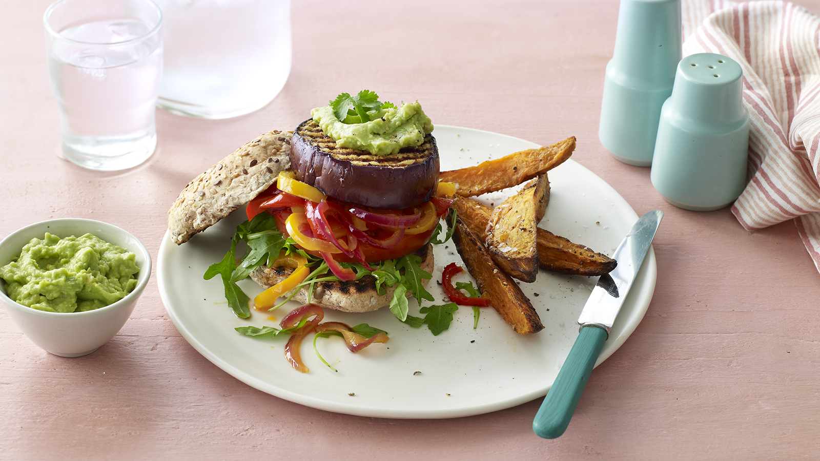 Place the four bread roll bases between four plates and top each with a small handful of rocket, then a slice of tomato. Divide the pepper mixture between the rolls and top with the aubergine. Spoon the avocado mayo on top, garnish with a few coriander sprigs, if using, and cover with the roll tops. Secure with a wooden skewer if you like. Serve immediately.